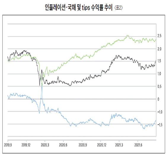 장기적인 기대 인플레이션 수치도 다르지 않다. 10년 만기 국채와 동일 만기의 인플레이션 대비형 국채인 TIPS 사이의 수익률 격차를 나타내는 기대 인플레이션은 현재 2.37%를 기록하고 있다. 지난해부터 양자 사이의 '스프레드'가 크게 벌어지기 시작한 결과다.