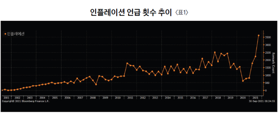 #인플레이션이 화두 = 기업실적에 대한 컨퍼런스 콜에서 인플레이션에 대한 언급이 지난해부터 급격히 늘어나다 지난 분기 중 20년래 최고치를 기록했다.