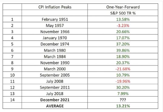 #인플레이션 고점 형성 그 이후 = 그런데 이렇게 인플레이션이 높이 나온 뒤 시장 성적은 어땠을까? 1950년 이후 인플레이션 고점이 형성됐던 시기는 역사적으로 열 세 차례 정도 있었다. 그런데 인플레이션 고점이 형성됐던 연도의 다음 해 시장 성적은 의외로 좋았다.