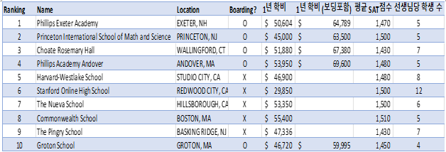 6위에 위치한 Stanford Online High School을 제외하고 일반적인 9개의 고등학교의 평균 학비는 $50,000이 넘는다. 기숙옵션이 있는 학교의 경우 기숙학비로 계산하면 $60,000이 넘는 비용을 4년간 매년 지불해야 한다.