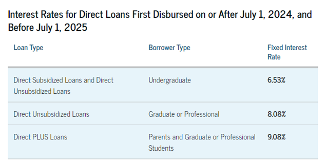 FRB의 고금리정책에 높은 수준의 금리를 계속 유지 중 이기에 10년 국채이자율을 기준으로 하는 학생대출금리도 6.53%로 매우 높아졌다. 학생대출 말고 다른 방법은 학부모님이 부족한 학비만큼 대출을 받는 Parent PLUS Loan이있다. 하지만 이 PLUS Loan의 이자도 9.08%이고 4%의 origination fee도 붙는다.