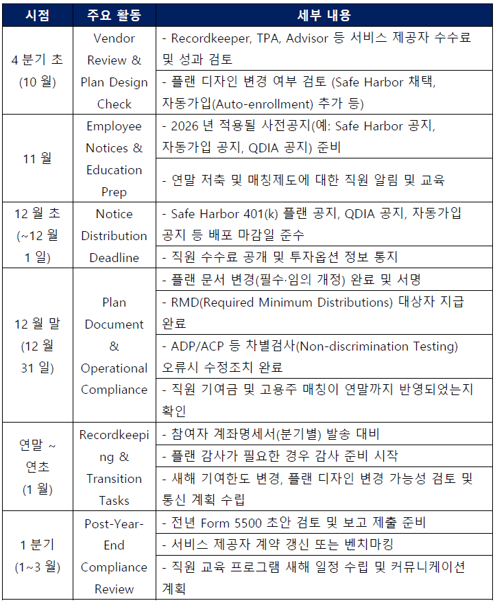 - 연 1회 이상 플랜 리뷰를 제공하고, 법규 개정, 투자시장 변화, ERISA 업데이트 등을 제공한다.