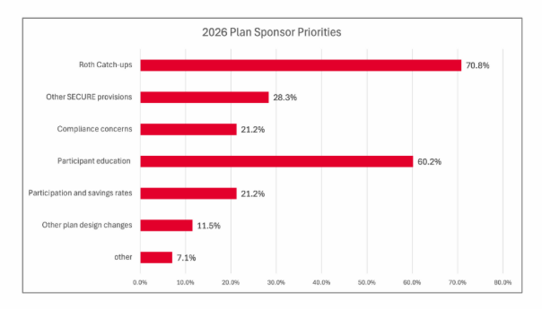 미국 퇴직연금 운영자협회(Plan Sponsor Council of America)가 매년 401(k) Sponsor 그룹을 대상으로 ‘새해에 스폰서가 중요하게 생각하는 업무 우선순위’ 를 조사해 발표하고 있다. 최근 발표된 자료에 따르면, 지난 몇 년간 Sponsor들의 주요 관심사는 SECURE Act 2.0법안에 따른 변화였으며, 2026년의 경우 특히 고액 연봉자의 Roth Catch-up 적용을 위한 준비 업무에 집중하고 있는 것으로 나타났다.