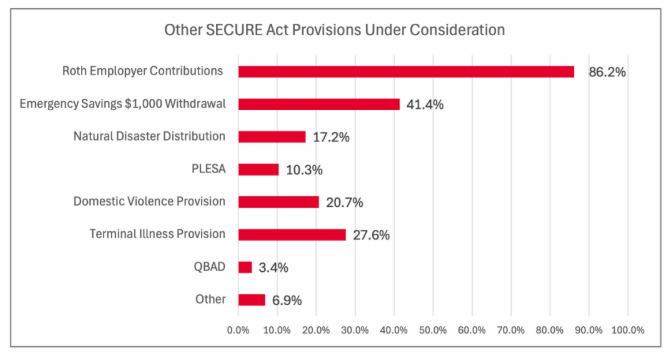 2026년 기타 SECURE Act 조항들에 관심을 가지고 있는 스폰서들 가운데, 약 87%는 향후 Roth 계좌에 대한 Employer의 Contribution / Matching 제공을 검토 중이며, 약 41%는 연간 $1,000의 비상자금 인출 조항 도입을 고려하고 있다고 밝혔다. 그 외에도 학자금 대출(Student Loan)관련 조항과 60~63세에 대한 Super Catch-up 도입도 검토한다고 응답하였다.